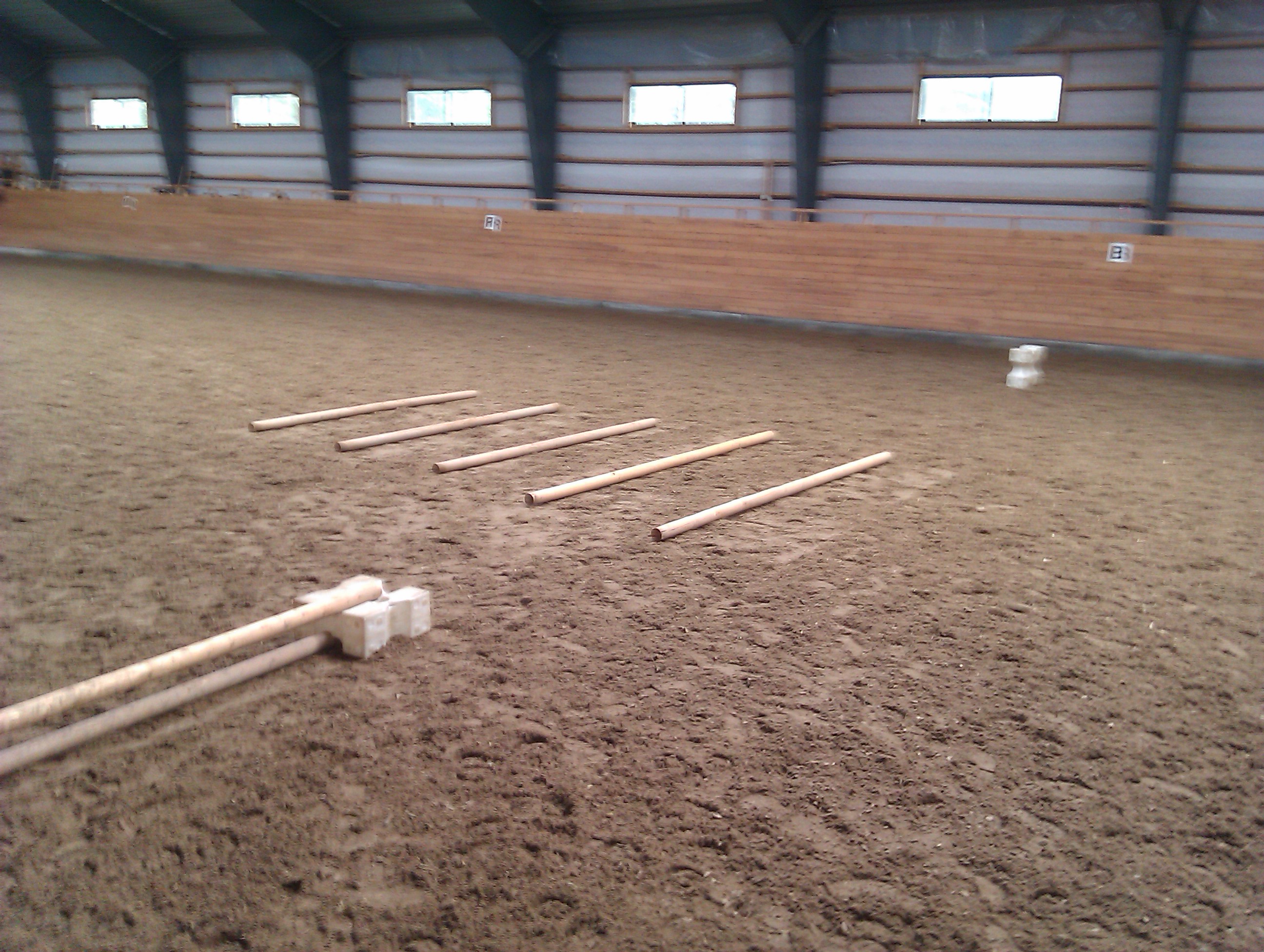 Vi värmde upp med att rida serpentiner ”åt fel håll” över ridbanan. Rakt framför sockerbiten gjorde vi halt. Sedan gjorde vi en första serpentinbåge och fortsatte över travbommarna, som jag till en början hade ett normalt travavstånd på. (Sedan längde jag avståndet lite så att Lillebror fick sträcka på sig.) Vi gjorde en ny serpentinbåge, och hoppade sedan det lilla hindret i trav. Huvudsyftet med övningen var att Lillebror skulle lyssna helt på mina hjälper, både på vändande hjälper på ganska tighta bågar, och på förhållande och drivande hjälper bla vid halten. Den här övningen går ju att variera på många sätt, på en äldre häst kan man t.ex göra övningen i galopp med halva arbetspiruetter istället för bågar.
