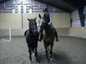 Vi var 7 st som hoppade ikväll, vilket innebar att Lillebror hade en hel del kompisar att prata med. Han försöker charma vem som än står bredvid när han väntar på sin tur att hoppa. Dessutom hjälpte han till att skritta fram Danne medan Anna byggde bana.. Danne gick lös i ridhuset och följde Lillebror som en svans trots alla andra hästar därinne… Han är verkligen löjligt snäll och påminner mest om en stor svart labrador! När det kom in ston i ridhuset tog jag Dannes tyglar och hade honom som handhäst, men jag tror faktiskt inte att det hade behövts, han trivdes så bra i svansen på Lillebror!