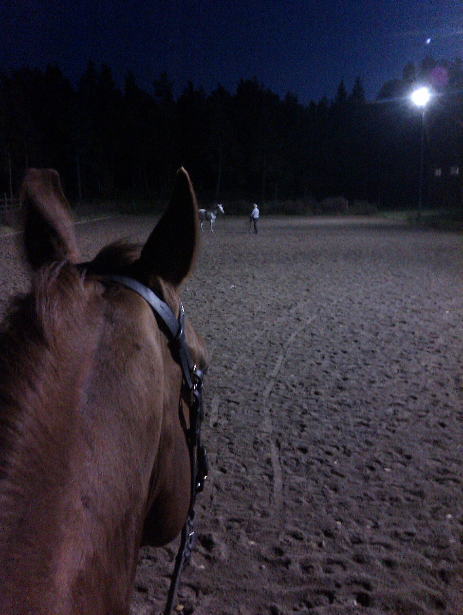 Idag har jag ridit en hel del. Båda Don:arna, alltså Don Larson och Don Cameron :) Båda fick gå i ridhuset innan hagutsläppet. Arbetet som behövdes var däremot helt olika. DL var seeg, och verkade bara uppgivet dagdrömma om att få komma ut i hagen. DC verkade också bara tänka på att få komma ut i hagen, men hans strategi var snarare att vara så kvick i fötterna att han skulle kunna studsa ut genom ridhustaket. Egentligen gillar ingen av dem att behöva ridas innan de fått vara i hagen, men det är bara att vänja sig, det måste ju fungera med meeting. Jobbet med Larson var i alla fall att han skulle svara framåt för mindre hjälper. Han var ganska duktig, och galoppen blir bara bättre och bättre! DC fick galoppera av sig ganska ordentligt, och sedan var han riktigt fin, med bra stöd på bettet och fin trav över ryggen. Han lämnade ridhuset med öronen droppande av svett, men väldigt nöjd med sig själv!!