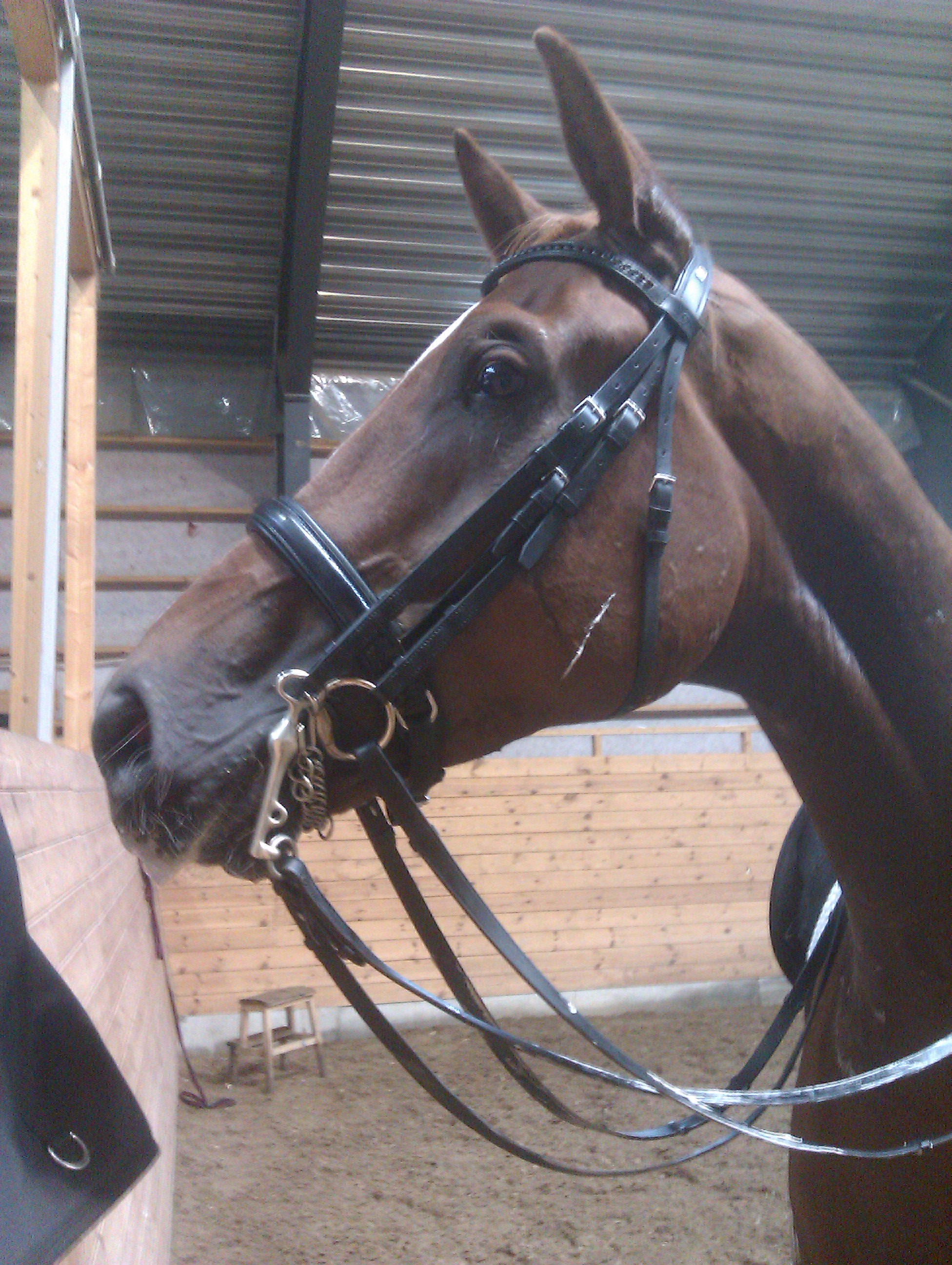 Insåg att jag måste beställa ett och gick då förstås till ”min egen” butik My One och vad hittade jag där?!?! Jo, ett träns av märket Capriole, som var precis det jag sökte. Ett enkelt svart träns med pullbackgrimma och silverfärgade spännen i storlek X-full. De tyglar jag ville ha fanns också; släta med många stoppar, silverfärgat spänne och franska hakar, och alltsammans var så bra pris på att det inte gjorde något att jag fick komplettera med separata tyglar. Nu ska det bara provas på jättehästen, men jag tror att det kommer att passa!