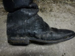 Stövlarna är normalt sett inte fullt så gräsliga som på bilden. De är faktiskt ett par Königs som jag köpte nästan oanvända av ”Bugg” för många år sedan. De används mest när jag rider ut skogen och när vi hoppar och de blir väl inte alltid lika väl behandlade som mina tränings- och tävlingsstövlar…