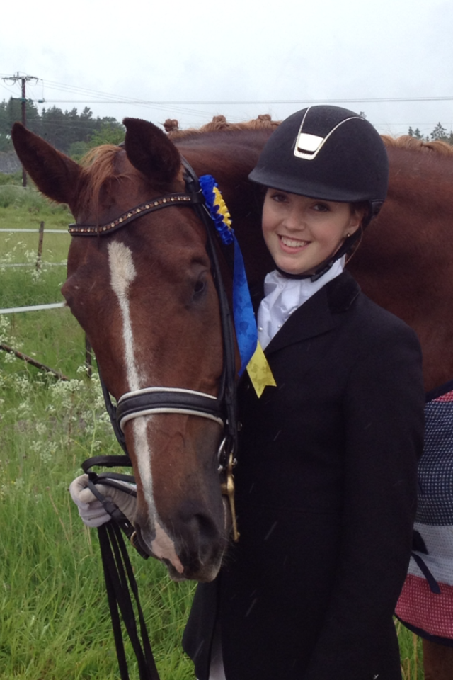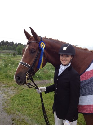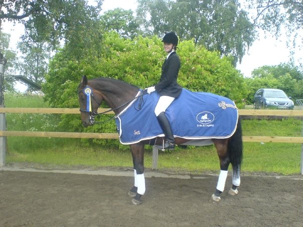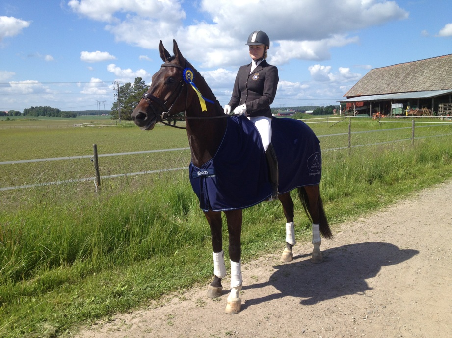 Så bytte jag till ett par torra handskar, mamma fick torka tyglarna med handduk och DC blev av med ländtäcket. Jag och min tvåfärgade häst – fux på bakdelen där täcket legat, mörk svettfux på resten av hästen – gick in i ridhuset och körde verkligen järnet. Jag är så otroligt nöjd med vår ritt – DC kändes kanon både vad gäller form, gångarter och uppmärksamhet, han bar sig själv bra, var mjuk och smidig och lyssnade 100% på mig. Programmet flöt på helt utan missar och jag log så att jag nästan skrattade när vi red sista mellantraven på medellinjen – så galet lycklig över den fantastiska ridkänslan.