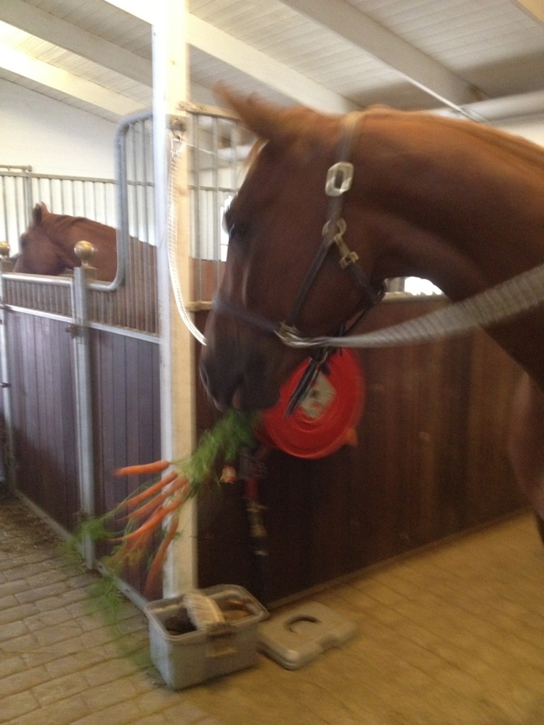 DC och jag hade alltså tidigare under dagen ridit ett pass för Jeanna. Det var i princip samma ridning som igår och allt fungerade toppen. Vi hade bra samling i galoppen och flera bra byten där DC dels var avslappnad i själva bytet, dels hade en jämn bjudning i galoppen både före och efter bytet. Morotsknippet som jag fick i studentpresent till DC gick åt direkt :) Den stora lådan McDonalds minimorötter finns det däremot många påsar kvar i!