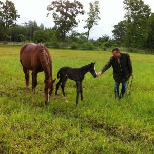 Tisdag morgon kl. 06:23 fanns det fina lilla stofölet i hagen utanför Amies fönster. Det är Patriks Dubonnet som är mamma till den lilla sötnosen, som har Züdenwind till pappa och De Niro som morfar. Kusin med Don Cameron alltså, som har De Niro som farfar.