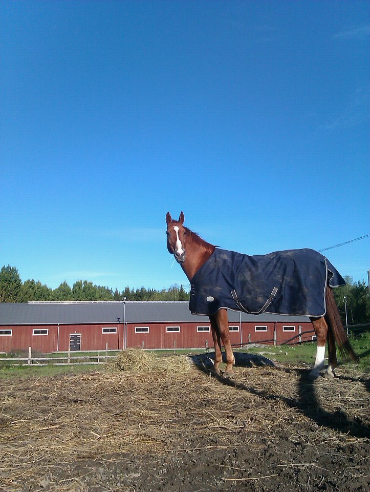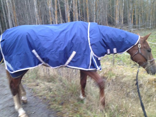 Nalle klädd i ett regntäcke från Capriole. Bilden är tagen när han åt frukost i hagen innan Elitdressyren på Djursholm 2011 :)