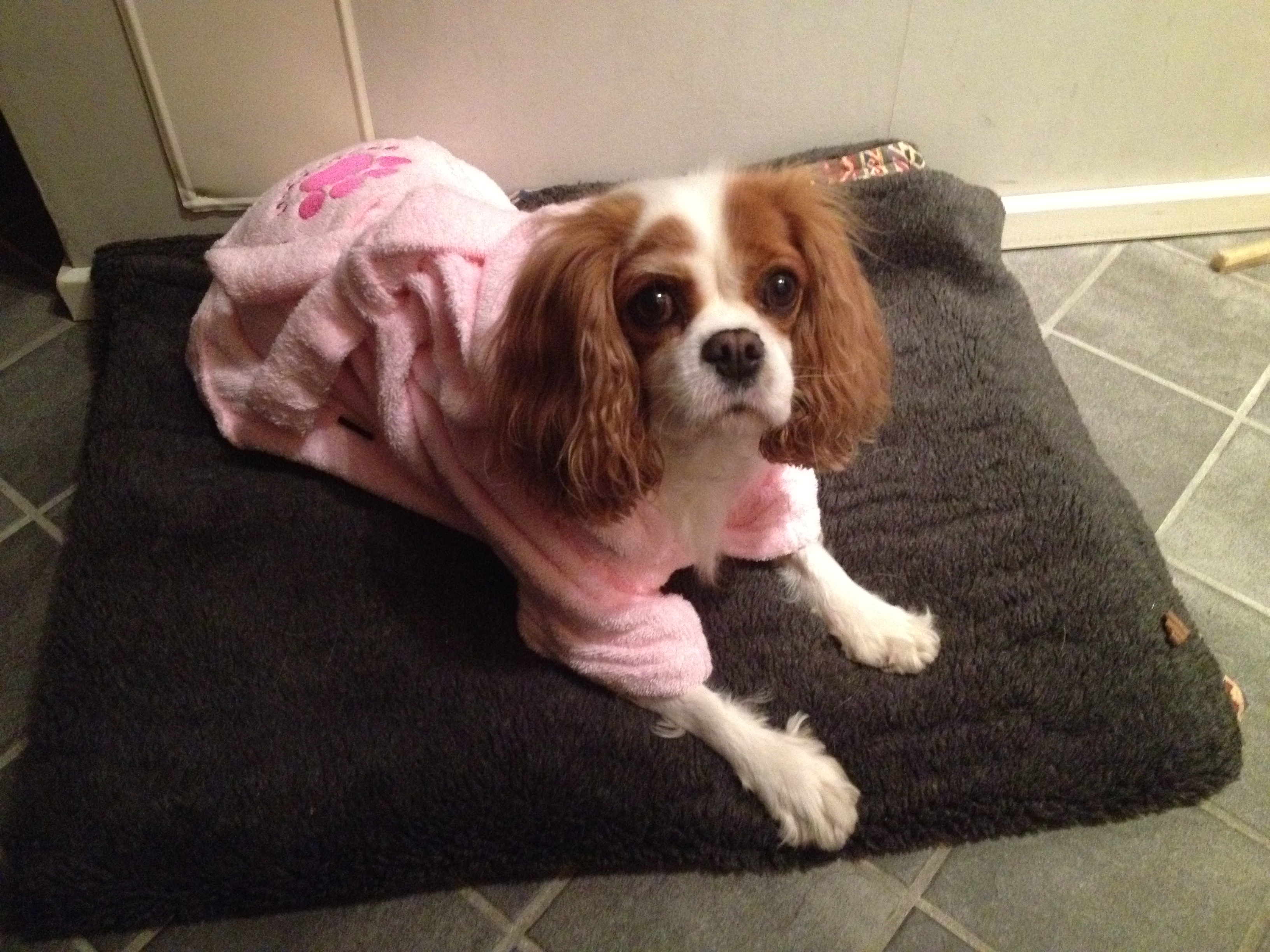 Vi bestämde oss för en rosa morgonrock som hon kan ha när hon har badat efter att hon varit ute i skogen. Mindre vatten på golvet mao!