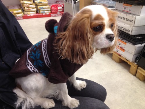 Chichi började med att prova en overall – hon blir så smutsig när hon är ute på promenad i det här vädret