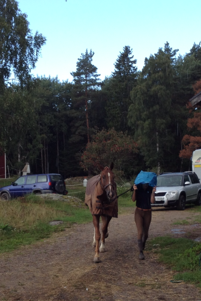 Före galoppen red jag min egen älsklingspålle. Det öste ner regn så jag tog på mig en speciell outfit när jag hämtade honom i hagen.