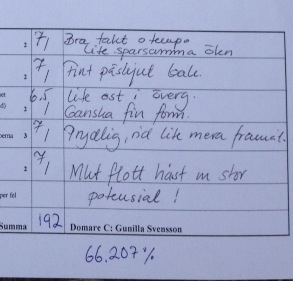 Jag är jättenöjd med bedömningen, det domaren skrev matchar min känsla till 100%. Alltid roligt när man känner så tycker jag, det är få saker som är så frustrerande som att få en bedömning som inte relaterar till ridkänslan, oavsett om det är åt det positiva eller negativa hållet.