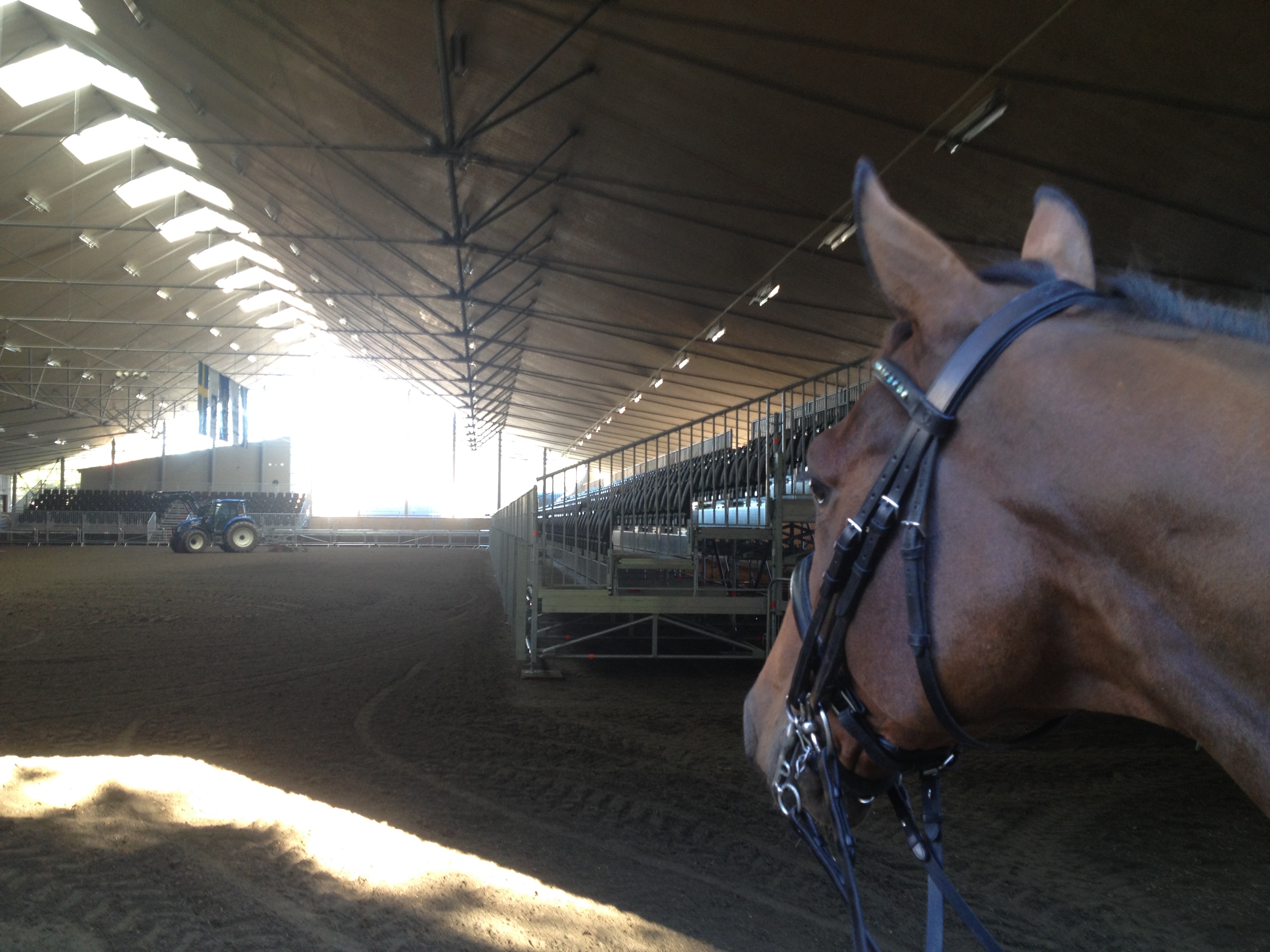 Igår var Facebookflödet fullt av ekipage som reste söderöver, mot Flyinge. Det är förstås väldigt skönt att vara på plats här på hemmaplan och uppstallad i sin egen box, men samtidigt har min lilla spooky Lord Lexington en helt ny Crafoordhall att brottas med. Där vi är vana vid att ha två fullstora dressyrbanor och lite till är det nu knökfullt med läktare och domarbås. Jag promenerar runt med Lexington och tittar på nya läskiga saker varje dag.