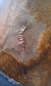 En spark en bit nedanför ögat gav ett fult hål och en fraktur in till bihålan. Det såg ganska obehagligt ut men hästen fick förstås bästa möjliga vård och verkade inte allt för ledsen själv!