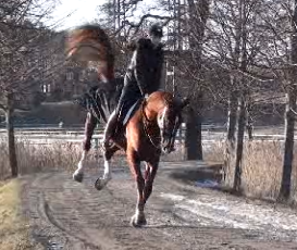 Det blev både dressyrridning och backträning. Dels red vi på raksträckan på slingan och utnyttjade den till att göra långa öppnor och slutor. Sedan galopperade vi sakta uppför långa backen ett par gånger, DC fick verkligen ta i! Därefter joggade jag honom på den breda delen där alla banorna möts.